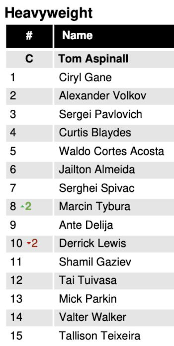 W królewskiej wadze Waldo Cortes-Acosta pozostał na 5. miejscu, a pokonany przezeń Derrick Lewis spadł o dwa oczka – pozycji 8. na 10. Zyskał na tym Marcin Tybura, który dzięki temu awansował na 8. miejsce w rankingu, wyprzedzając nawet… Ante Deliję.