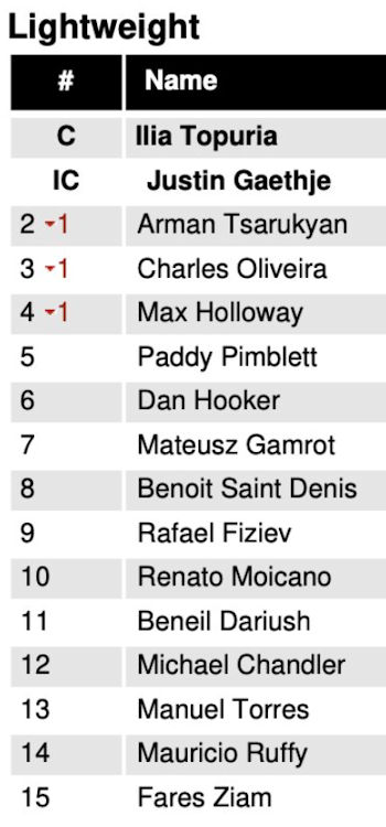 W rezultacie w rankingu 155 funtów doszło do kilku kosmetycznych zmian. Highlight – jako tymczasowy mistrz – zdystansował wszystkich rywali poza oczywiście Ilią Topurią. W konsekwencji o jedno oczko spadli Arman Tsarukyan, Charles Oliveira i Max Holloway.