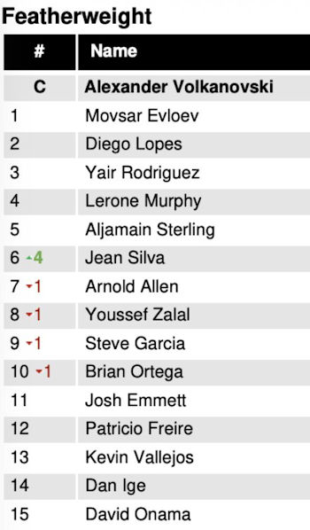 Największy awans w rankingu wagi piórkowej zanotował Jean Silva, który w Las Vegas wypunktował Arnolda Allena. Nieukrywający mistrzowskich aspiracji Brazylijczyk awansował z miejsca 10. na 6.