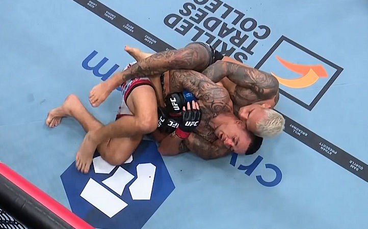 Wyłapał kilka uderzeń Oliveira na otwarcie rundy czwartej, ale kompletnie nic sobie z nich nie robił. Odpowiedział lowkingami, a następnie wpadł w klincz, gdzie po raz kolejny cisnął wyraźnie ustępującym mu pod względem siłowym Hawajczykiem o deski, układając go na dole. Potrzebował na to niespełna minutę.