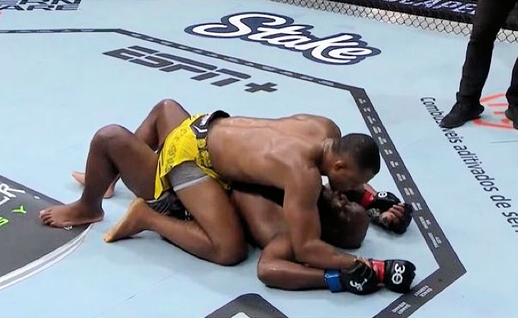 Z góry aktywnością Malhadinho jednak nie grzeszył. Oddał dosiad, preferując pozycję boczną, a potem półgardę. Amerykanin leżał plackiem – ale bezpiecznie. W końcu zerwał się na nogi, ale tylko na chwilę – Almeida rzucił się na niego, przenosząc ponownie walkę do parteru.