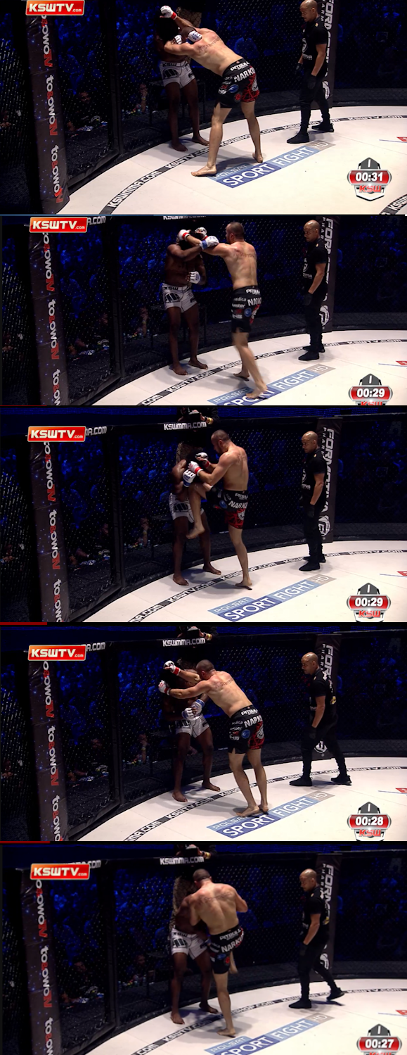 Będąc wyposażonymi w tę wiedzę, przyjrzyjmy się, co działo się, gdy Tomasz Narkun odwrócił pozycję i walka zaczęła przenosić się do klinczu. Poniższe obrazki ułożone są chronologicznie i umieściłem je w dużych rozmiarach, aby łatwiej było dostrzec, co się dzieje.