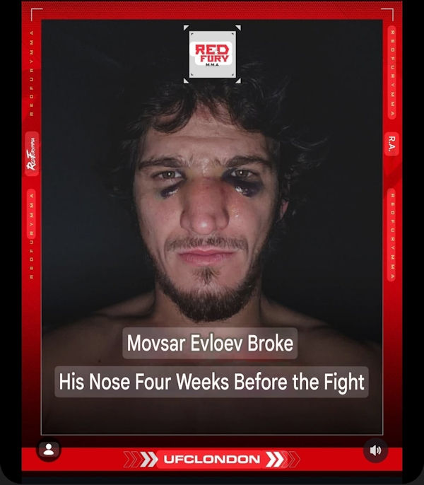 Jak bowiem w środę poinformował portal Red Fury MMA, Movsar Evloev na cztery tygodnie przed walką doznał poważnej kontuzji – a mianowicie złamał podczas treningu nos.