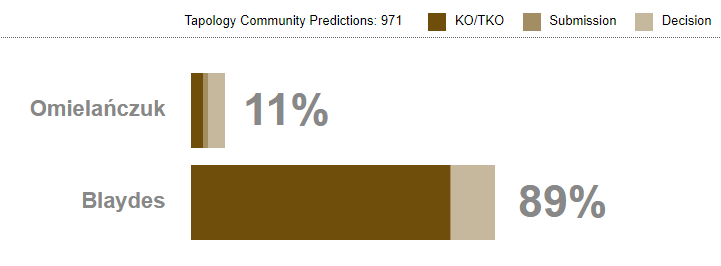 Omielańczuk będzie miał swoje szanse w dystansie, ale prawdopodobnie przy pierwszej nadarzającej się okazji złapie go w klincz lub przewróci go, zasypując go uderzeniami z dominującej pozycji. Typuję Blaydesa przez TKO w drugiej rundzie.